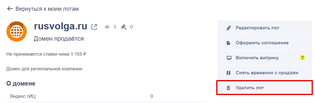 Как удалить лот из Магазина доменов